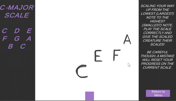 A fun little game combining musical scales with animal scales. Use the AD or left and right arrow keys to move the purple box around and collect the right notes for the scales. You can start with any scale from the main menu but I would recommend starting with the C-Major scale.